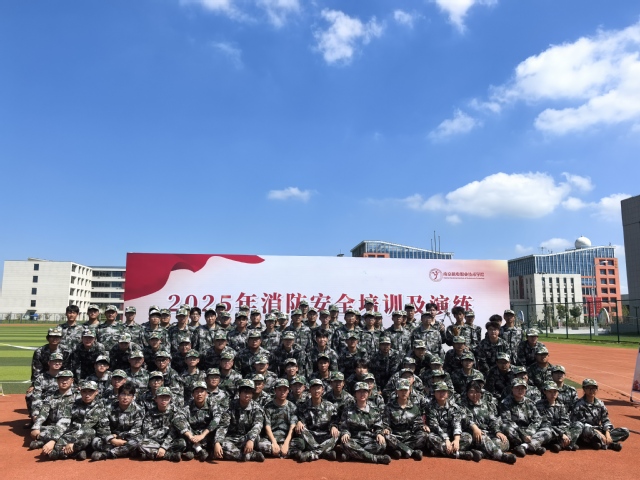 活动尾声,参与演练的新生们在“2025年消防安全培训及演练”主题背景板前合影留念,迷彩服的军绿色与消防设备的红色交相辉映,定格下这场“安全实训”的深刻记忆。