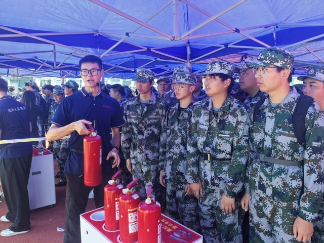在消防装备展示区,消防技术人员化身“科普讲师”,为新生们逐一讲解各类设备的功能与用法。