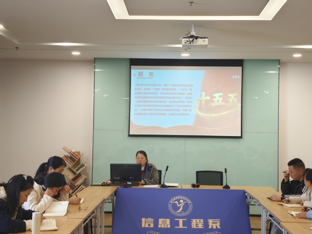 2025年11月27日下午,信息工程系党支部在弘毅楼602教室开展“深学细悟党的二十届四中全会精神 凝聚奋进新时代磅礴力量”专题党课。本次党课由党支部书记陈雪主讲,信息工程系全体党员参与,旨在引导党员精准把握全会精神实质,将思想与行动统一到党中央决策部署上来,以理论指引实践,为教育事业发展注入动力。