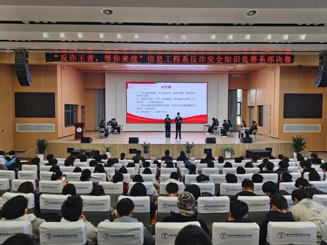 本次竞赛是信息工程系反诈宣传教育工作的一次创新实践。通过班级选拔和初赛,最终有五支班级队伍进入决赛。竞赛内容贴近大学生活,覆盖刷单返利、购物诈骗、冒充客服退款等多类常见骗局,同时也涉及新型网络诈骗的识别方法。通过真实案例改编,让学生看清诈骗套路,明白“不贪小利、不轻信他人”的重要性。竞赛中必答题考验了大家对反诈基础知识的掌握,抽答题则模拟真实诈骗场景,灵活设问,考察临场判断与反诈预警应用能力。现场气氛紧张热烈,选手的精彩回答不时引来阵阵掌声。互动环节中主持人邀请现场同学抽题抢答,大家在轻松的氛围中一起学习反诈知识,实现了“台上竞技、台下共学”的效果。