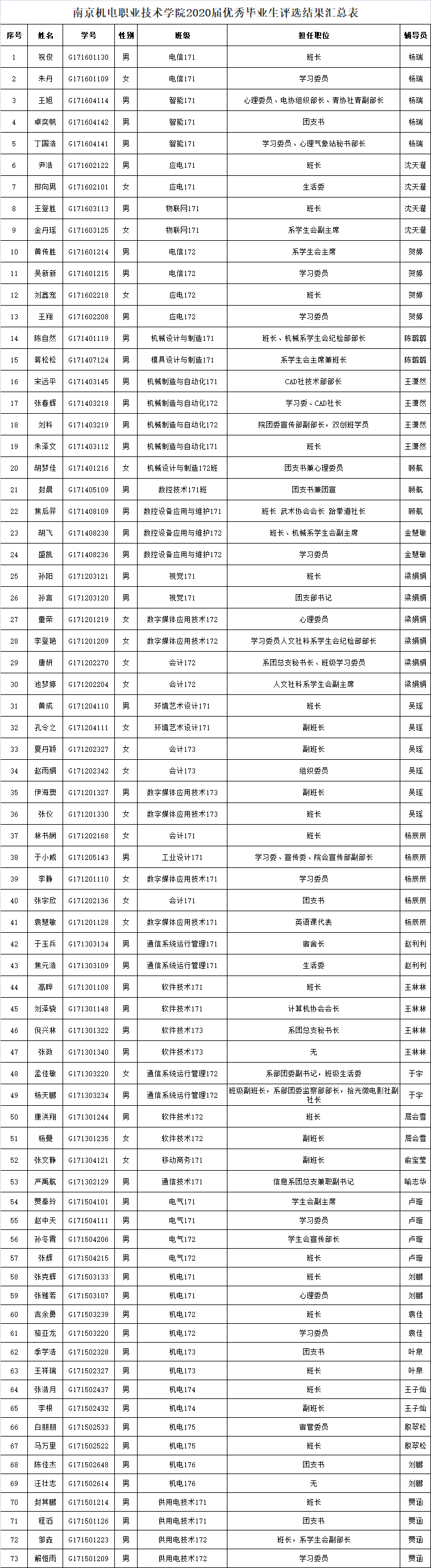 根据南机电院 学[2]号《关于评选2020届优秀毕业生的通知》,经班级评选,系部审核,学工处复核,决定拟推荐以下73名同学为2020届开云手机官方版页面登录入口优秀毕业生。现予以公示,公示时间:2020年6月24日—2020年6月30日。联系人:宁燕,电话:025-84190262,18061230078。