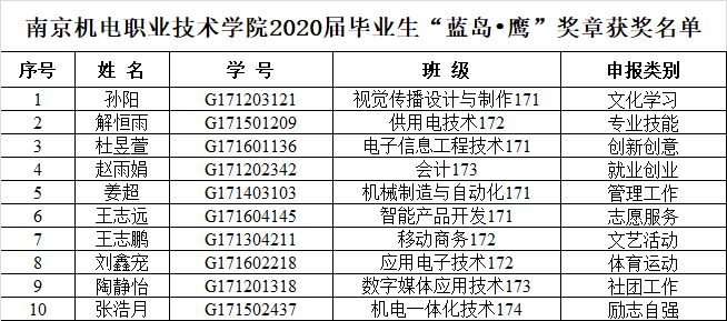 根据《开云手机官方版页面登录入口关于开展2020届毕业生“蓝岛•鹰”奖章评选推荐工作的通知》,经系部评审小组初步审核,学工处复核,专家评审组评审,决定拟推荐以下10名同学为2020届毕业生“蓝岛•鹰”奖章获得者。现予以公示,公示时间:2020年7月2日—2020年7月6日。联系人:宁燕,电话:025-84190262。