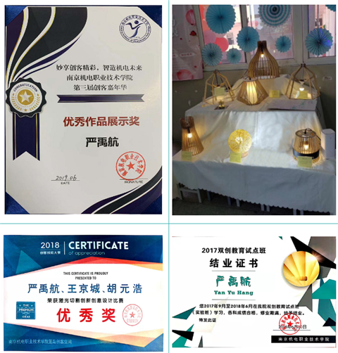 我的动手创造能力非常强,任何一件小玩意到我的手里总能创作出新的东西。在入校不久得知学院有蓝岛创客空间这个平台时,我第一时间申请加入了蓝岛双创教育试点班。在双创实验班中学习了很多新型的流行的创客工具,一次偶然的机会接触了激光切割机,我疯狂地迷上了激光切割工艺。从参观完激光切割工艺品过后,我开始自学CAD绘制基础图纸,用着不太熟练的快捷键命令,一条条直线逐渐在图纸上呈现出来,皎洁月光下熟睡的宿舍,我依旧在挑灯夜战画图纸。凭着坚持和不懈努力,不断优化完善,图纸终于完美呈现。并在创客导师的指导下,通过RDWORKS软件和学院创客工坊的激光切割机进行了切割尝试。果然功夫不负有心人,经过后期拼装,一盏精致北欧风格的创意吊灯呈现在大家面前。目前创意吊灯已经成功申请了国家外观设计专利。可调节的游戏键盘摇杆已经成功申请国家实用新型专利。在学院举办的创客活动中,我也一直积极参与。在三创大赛、创客嘉年华无不留下了美好的足迹。