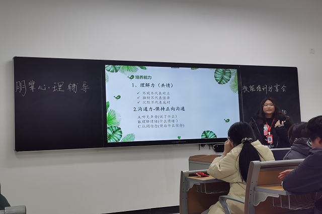 最后,陈海慧同学分享了成为一个优秀的心理委员需要具备的品质。比如正向积极,豁达宽容,团结合作,耐挫坚毅等等,具备这些优秀的品质让心委们在帮助他人时也会感染到他人。心理委员还需要以理解力,沟通力,觉察力和执行力相结合的行动方式,促使来访者寻找解决问题的办法。