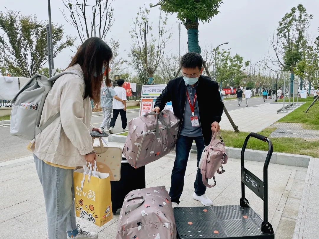 各相关职能部门精细部署各项工作,我校每日安排教师志愿者在学校东门进行老生返校协助工作,提供了全面优化的一站式服务,校门核验、行李转运、入住宿舍等流程便捷高效,提升了学生返校效率,返校现场井然有序。
