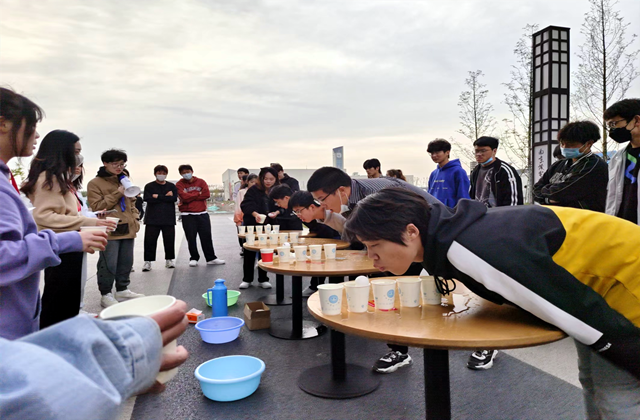 本次活动主要考验同学之间的团队协作能力,激发同学们的集体荣誉感和团队精神。本次趣味活动一共有两个内容,分别为“气球传纸杯”、“巧吹乒乓球”,这两个活动由同学们自由组队自行参与,以用时长短作为判断标准。现场气氛十分热烈,同学们都团结协作、以饱满的热情积极参与、大显身手。工作人员根据比赛规则严格把关,确保了比赛的公平公正。
