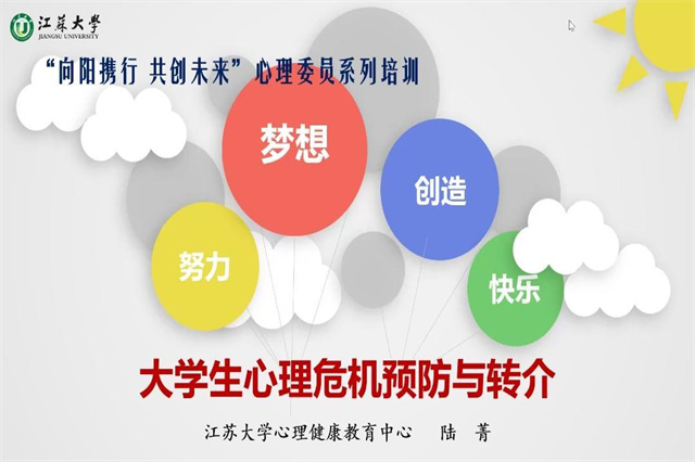 为提升广大心理委员的工作水平,发扬朋辈助人的优良品质,带领和引导全校学生心向阳光,砥砺前行,2022年4月12日下午,大学生健康成长中心举行了“向阳携行 共创未来——大学生心理危机预防与转介”线上主题培训。本次培训特邀江苏大学心理中心副主任陆菁老师主讲,由大学生健康成长中心龚智俐老师主持。