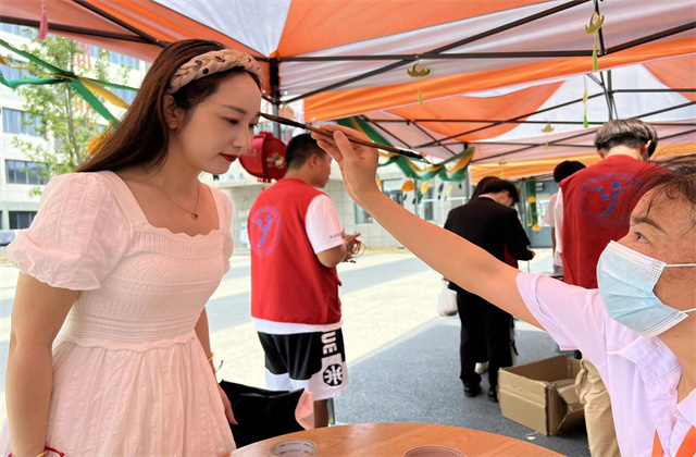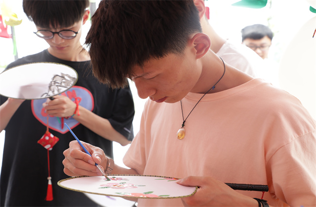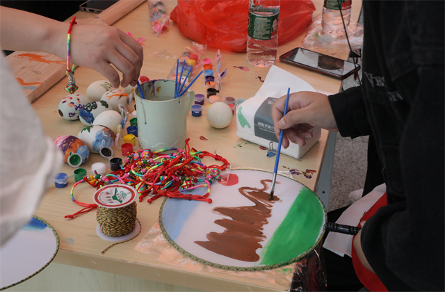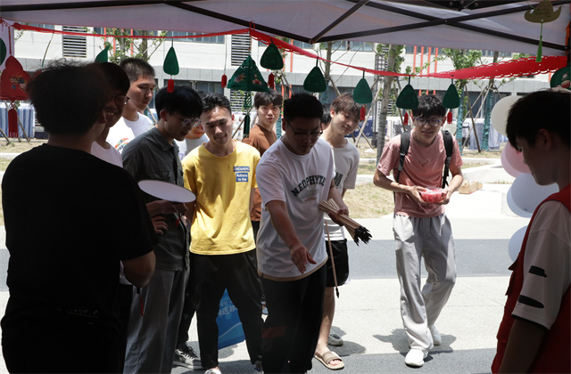 五色新丝缠角粽,金盘送,生绡画扇盘双凤。农历五月初五端午节,又称端阳节、龙舟节等,是集拜神祭祖、祈福辟邪、欢庆娱乐和饮食为一体的民俗大节。活动现场,传统文化宣讲、点雄黄酒、投壶、DIY端午彩绳、DIY古风扇、DIY鸭蛋、DIY端午香包、DIY端午驱蚊香包等活动吸引了众多师生参加。