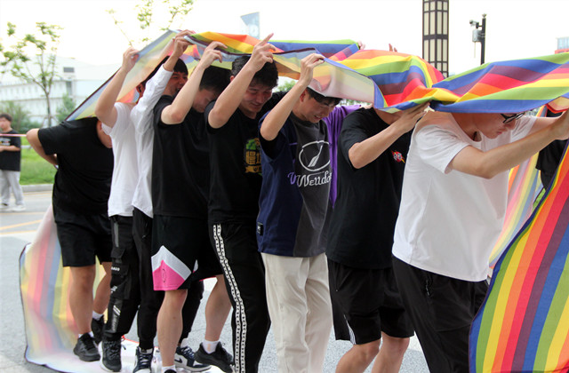 在类似坦克履带帆布“轮子”里,大家按分工前后排开,两手撑举帆布,脚登“履带”,一个个全神贯注,脚步敏捷,通过手脚并用及团队配合从起点快速“驶向”终点,现场气氛火热,参赛队员们拼尽全力,激烈的比赛场面令人振奋,奋力拼搏深深感染着现场的每个人。
