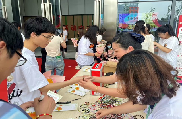 毕业季,同学们和阿姨合影承载着太多的不舍,太多的留恋。宿管阿姨将无数个日夜准备的专属礼物亲手为同学们戴上,小小的手绳承载着宿管阿姨深深的牵挂。邢香爱阿姨作为宿管阿姨代表与众多老师为毕业生献唱《祝你一路顺风》,愿大家离开母校,未来一路顺遂。孔敏阿姨作为宿管阿姨代表接受了同学代表的献花。