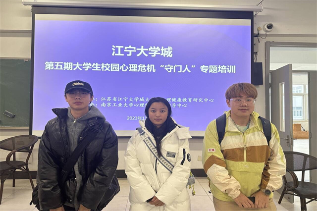 为提升学校心理骨干成员识别和干预校园心理危机的能力,我校选派罗国柱、汤阗瑞、王宇阳三位同学于2023年11月25日前往南京工业大学参加江宁大学城第五期大学生校园心理危机“守门人”专题培训。