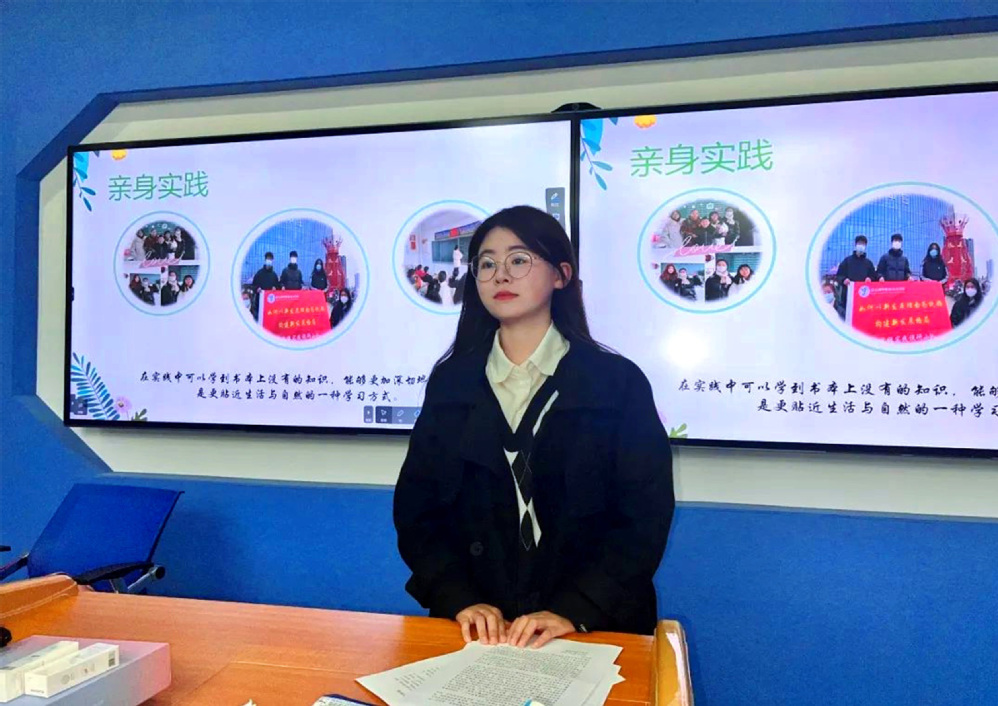 作为校资助宣传大使,她主动学习各种国家资助政策相关的知识,将所有自己学到的知识梳理贯通做成PPT。积极配合学校资助中心老师开展大型学院资助政策宣讲会,并担任主持人为全院同学进行资助政策的宣讲,她尽力将资助政策传递给每一位同学,愿每一位同学都可以真正地了解国家资助政策有哪些,具体的内容是什么,这样当他们有需要时都可以向国家请求帮助,也进一步能够支持同学们在学业上的追求。