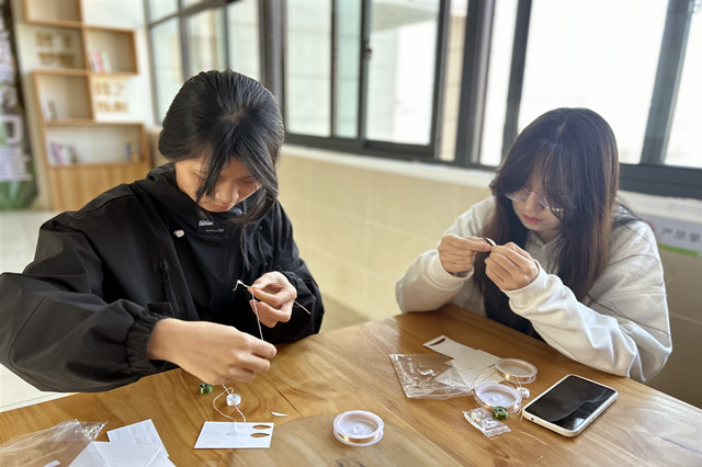 缠花源于明代,盛于清代,是用多色丝线在以纸板或者铜丝扎成的胚架上缠绕出的传统美术品,是国家级非物质文化遗产。在师生们的互相帮助下,指尖流转出春天的花朵。体验着丝线交织在花瓣模型上,见证着花瓣拼凑起一朵灿烂的花。亲手制作属于自己的发簪、发钗。不仅锻炼了动手能力,还有一份独一无二的春日记忆。