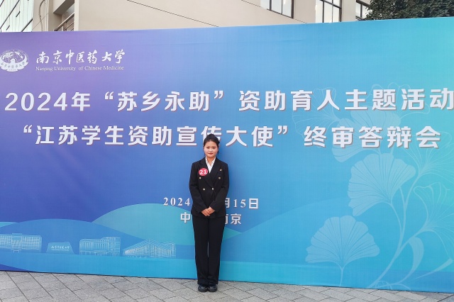 近日,江苏省教育厅公布了2024年“苏乡永助”主题活动“江苏学生资助宣传大使”终评结果。我校2022级学生资助宣传大使王子怡同学凭借优秀的综合素质和出色的现场陈述答辩,从全省众多参选者中脱颖而出,成功当选“江苏学生资助宣传大使”(全省共60名)。