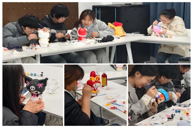 活动现场,同学们热情高涨,纷纷拿起画笔,尽情挥洒自己的创意与情感。有的同学喜欢淡雅的色彩,有的则大胆运用撞色,勾勒出个性鲜明的图案,有的将石膏娃娃绘成超级英雄,展现出勇敢无畏的精神。有的则绘成可爱卡通形象,萌态十足,洋溢着童真。他们或是独自专注创作,或是与朋友相互分享绘画成果。在彩绘过程中,同学们不仅锻炼了绘画技巧,更重要的是学会了如何通过艺术来表达自我、释放压力。经过一个多小时的精心绘制,一个个原本素白的石膏娃娃被赋予了鲜活的“生命”化身为一件件独一无二的艺术品。此次活动还特别设置了互动环节。同学们在完成自己的作品后,可以互相欣赏、交流心得,并在作品前合影留念。这种互动不仅增进了同学间的友谊,还激发了更多的艺术灵感。