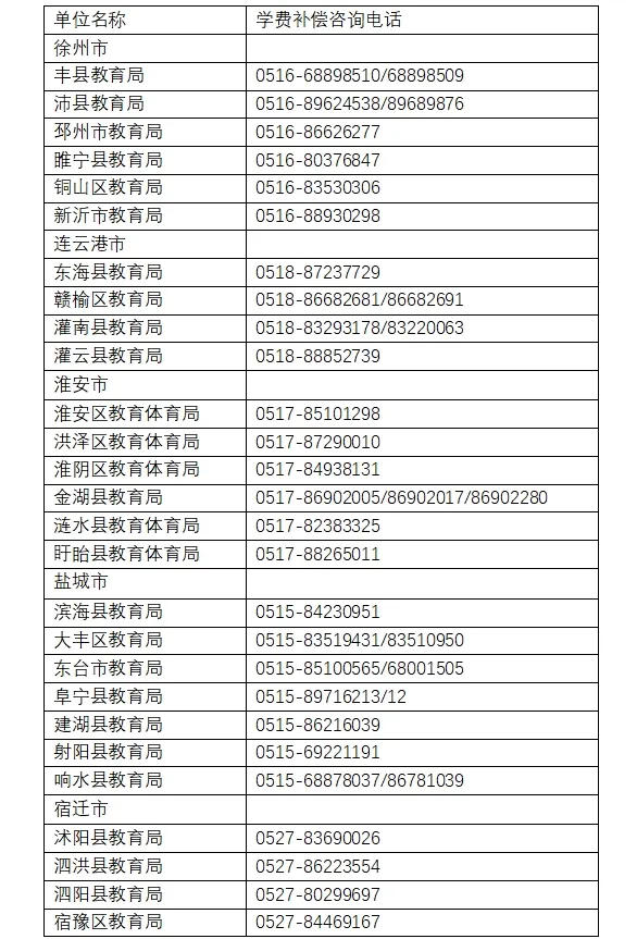 学费补偿咨询电话,申请江苏省高等学校毕业生学费补偿政策时如有疑问,请与就业地县(市、区)学生资助管理中心联系,咨询电话如下: