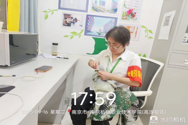 军训期间,针对新生军训服频繁使用易出现破损的情况,多位宿管老师主动在值班室备好针线盒,利用休息时间义务为学生缝补衣物。一针一线之间,不仅修补了衣裤的裂口,更传递了校园如家的温暖。许多新生表示:“老师帮忙补衣服,特别贴心,像在家里一样。”