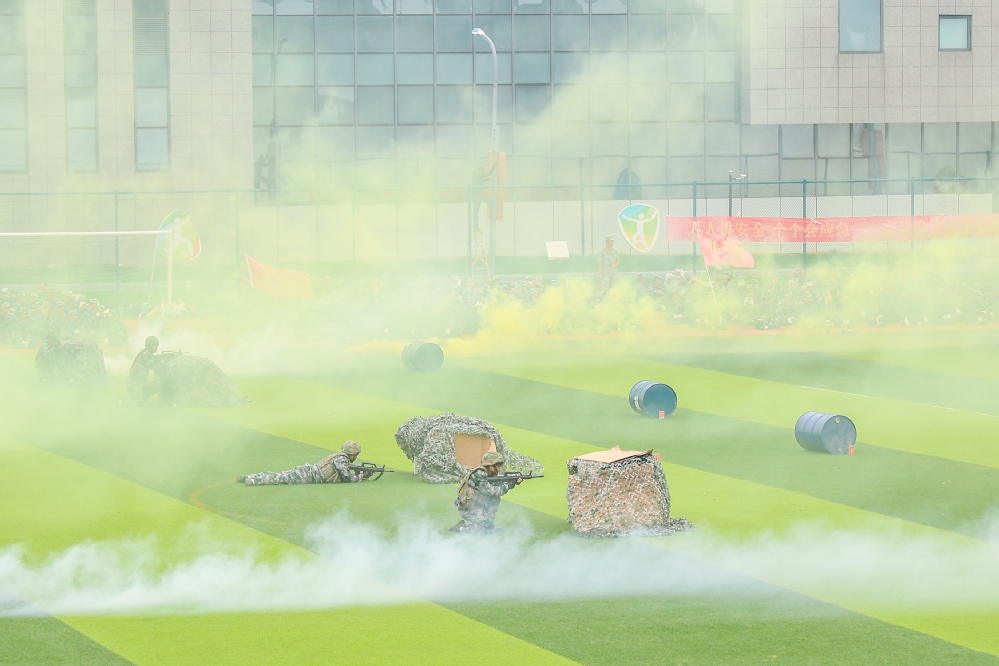 分列式后,各营学生还依次进行了擒敌拳、匕首操、战术救护等军事科目演示。机械工程系106人擒敌拳方阵气势如虹,人文社科系女生匕首操表演刚柔并济,战术救护演示展现了战场协同与应急救援能力,赢得了全场阵阵掌声。
