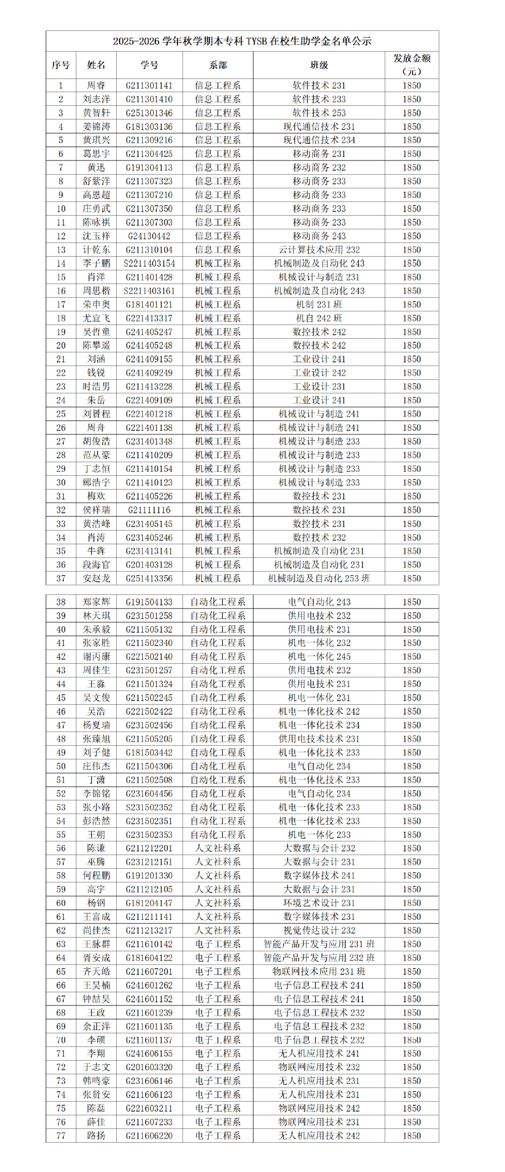 根据财政部教育部人力资源社会保障部退役军人部中央军委国防动员部关于印发《学生资助资金管理办法》的通知(财教〔2021〕310号)等相关文件规定,学校资助中心于10月开展了全日制在校退役士兵国家助学金核查工作,经系部核查上报、资助中心复查,确定以下77名退役复学(入学)学生获得2025-2026学年秋学期退役士兵国家助学金。
