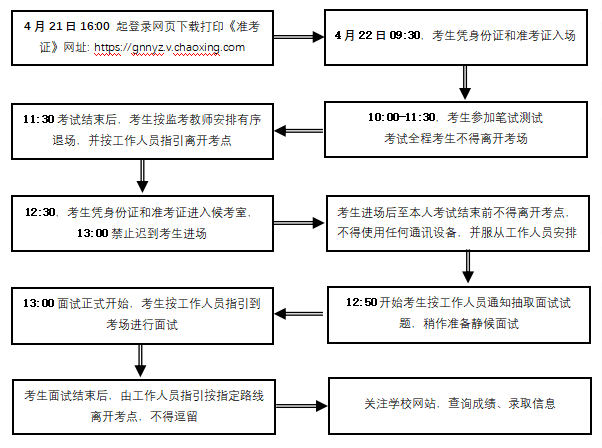 四、考生凭准考证和身份证(务必两证齐全,身份证丢失的应持由当地派出所出具的身份证明)按每场考试“入场时间”进入考场(或候考场),考试正式开始(即4月22日10:00和4月22日13:00)迟到考生不得入场,视为放弃考试;笔试考试全程(即4月22日10:00-11:30)不得离开考场;面试考试开始(即4月22日13:00)至考生本人面试结束前不得随意进出候考室、备考区、考场等区域,所有行径按工作人员引导执行。