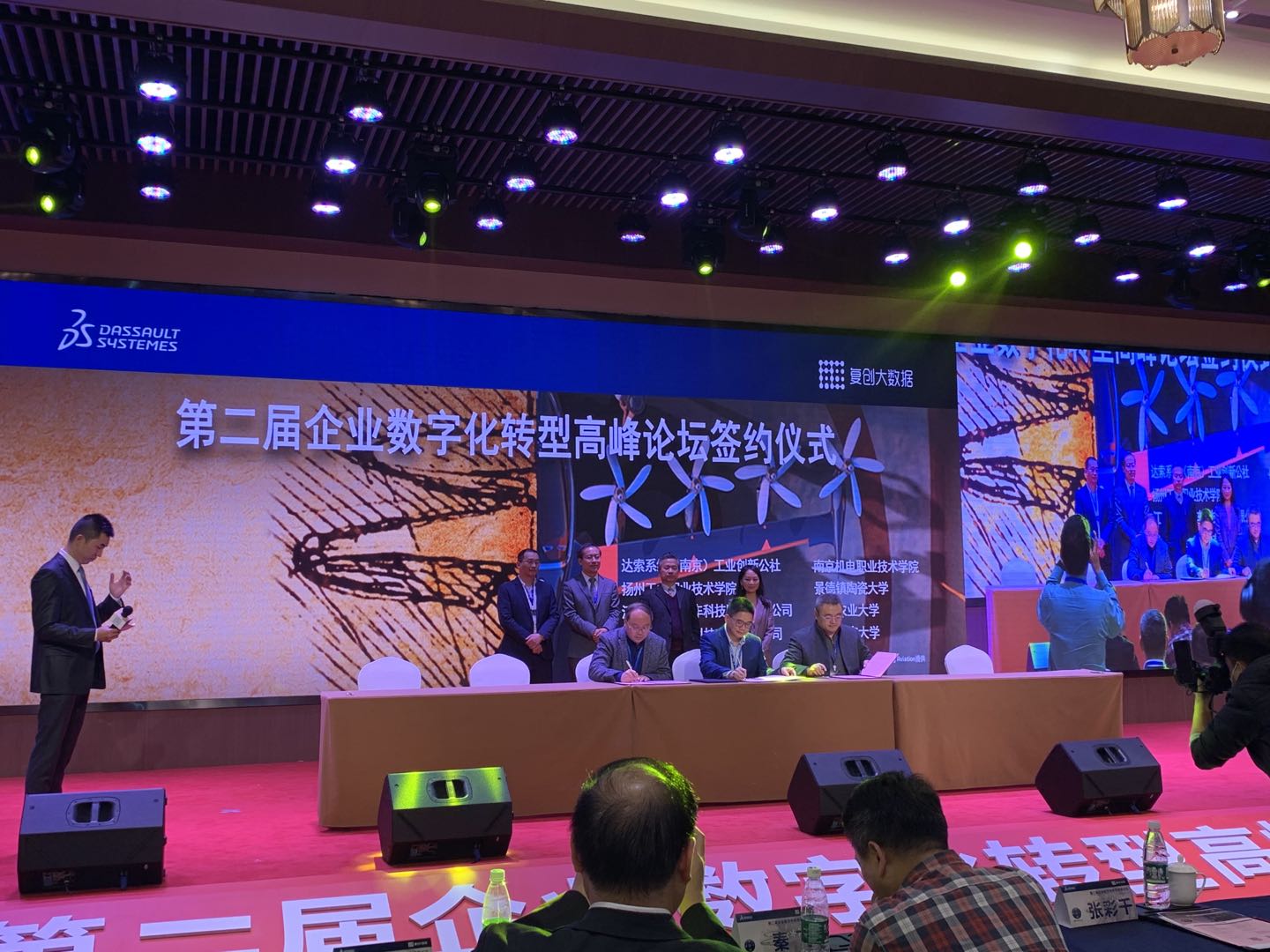 2020年11月25日,世界智能制造大会首场活动——第二届企业数字化转型高峰论坛签约仪式在南京未来科技城举行,签约仪式上,开云手机官方版页面登录入口智能制造学院与法国达索系统公司(南京)工业创新公社正式签署产学研战略合作协议,并达成共建南京机电达索创新中心的共识。开云手机官方版页面登录入口副院长刁爱军、智能制造学院执行院长潘理平、专业教师吴芬等参加合作签约仪式。
