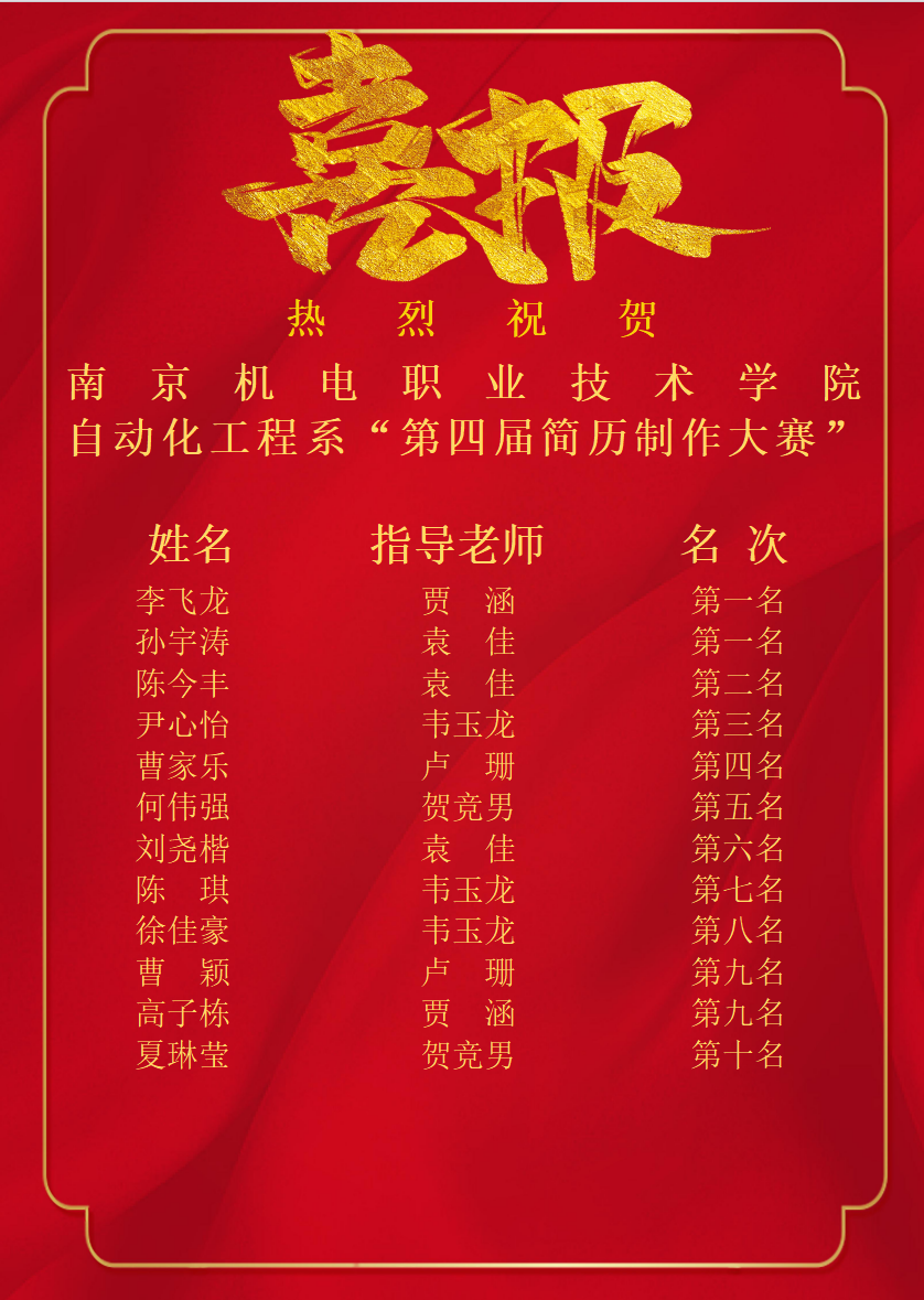本次简历制作大赛不仅提升了学生们的简历制作水平,帮助他们掌握了制作优秀简历的技巧从而“简”而出同时,也为系部营造一个更加积极向上的学习与就业氛围接下来5月12日的校园招聘会做好充足准备!