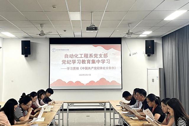 2024521,自动化工程系党支部在敏行楼401室举行党纪学习教育读书班集体学习会,开展第二次集体学习。支部全体党员参会,学习会由系党支部副书记杨军主持。
