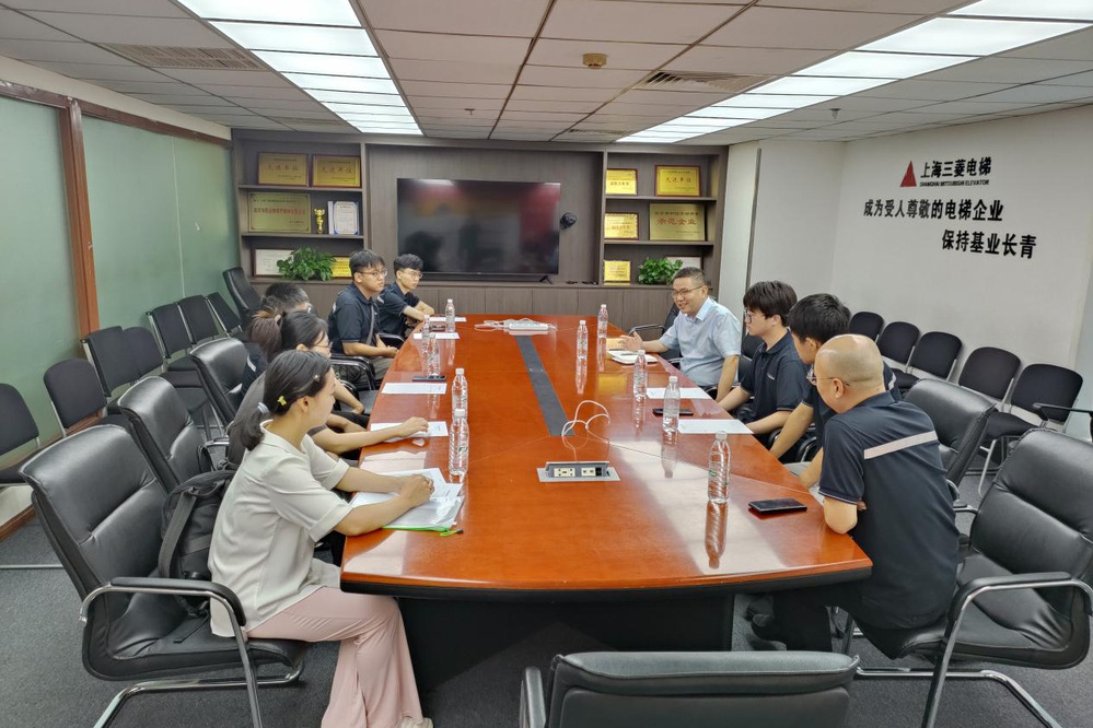 上海三菱电梯有限公司江苏分公司蒋总、秦教务长、实习生代表和系部访企教师进行了座谈交流。蒋总对学校学生的表现给予了充分肯定,表示实习生都虚心好学、勤勉踏实,有着较强动手能力,大多都能保质保量完成师傅交代的任务。