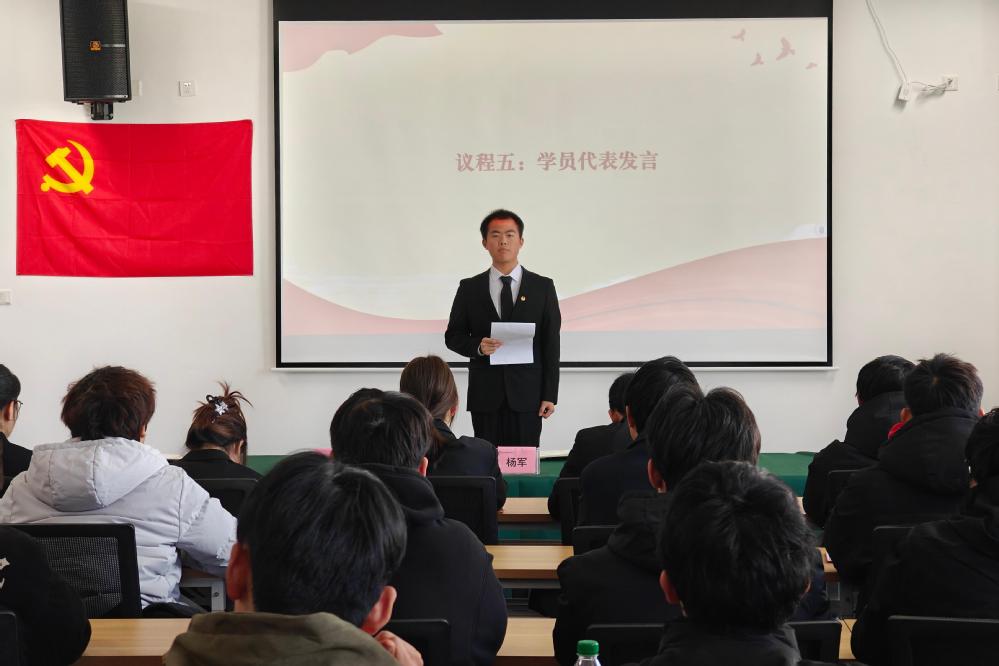 优秀学员孔德虎同学代表参培学员进行了发言。孔德虎感谢党组织给予系统党性培训的机会,表示将继续深入学习党的理论知识,不断提高自己的政治觉悟和思想水平,发挥模范作用,为早日加入中国共产党而努力奋斗。