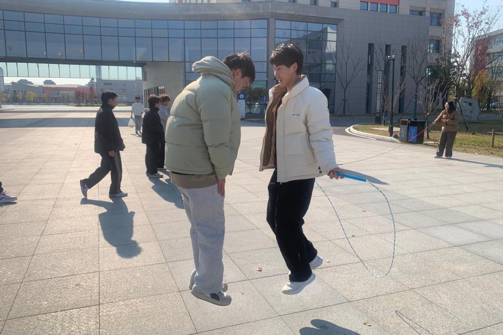在长绳跳区域,则是团队协作的精彩呈现。摇绳的同学们双臂有力地挥动,长绳在空中划出一道道完美的弧线。参与其中的师生们鱼贯而入,在绳间灵活穿梭,跳跃自如。大家脸上洋溢着灿烂的笑容,展现出青春的朝气与活力。现场的加油声、欢笑声交织在一起,形成了一曲欢快的校园乐章。学生们不仅享受到了运动的乐趣,更在与老师的合作中,学会了如何更好地沟通协作,深刻体会到了团队合作的重要性。