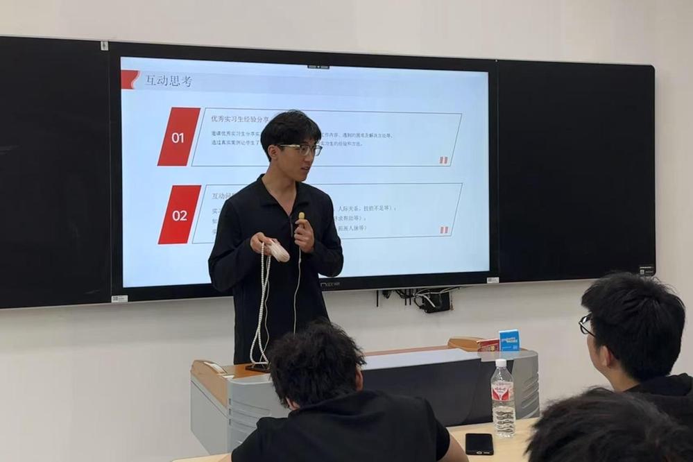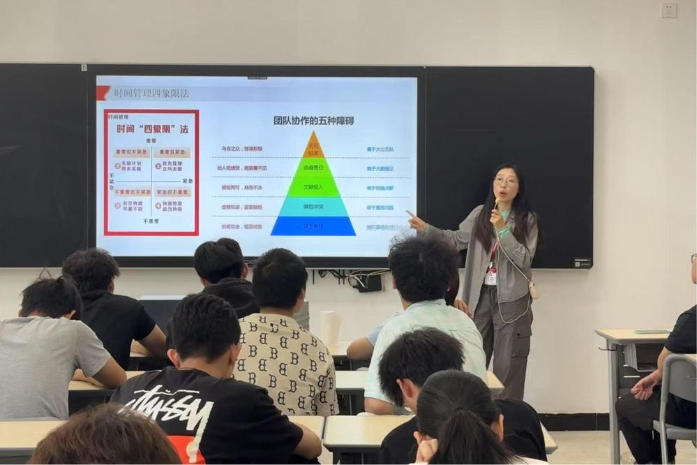 在第三环节,辅导员就实习中可能遇到的任务重时间紧的问题,为同学们介绍了时间管理工具“时间四象限法”,并对团队最有可能出现的五种问题给出了解决建议。通过对实习简历撰写要点的讲解、目标制定的SMART原则介绍,为同学们在实习应聘和实习目标的制定提供了方法。