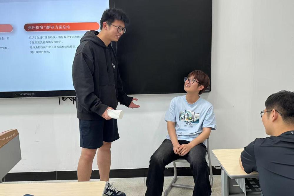 同学们通过设想实习中可能遇到的人际沟通问题,在班会第二环节“实习难题,我来解决”中模拟问题场景,生动展现了“实习中与上司产生争执该如何化解”的情景剧。表演结束后,辅导员针对这一情景剧提出了其中暴露出来的沟通缺陷,深入浅出地为同学们阐述了在职场中遇到类似问题,应如何机智且有效地寻求解决方案。