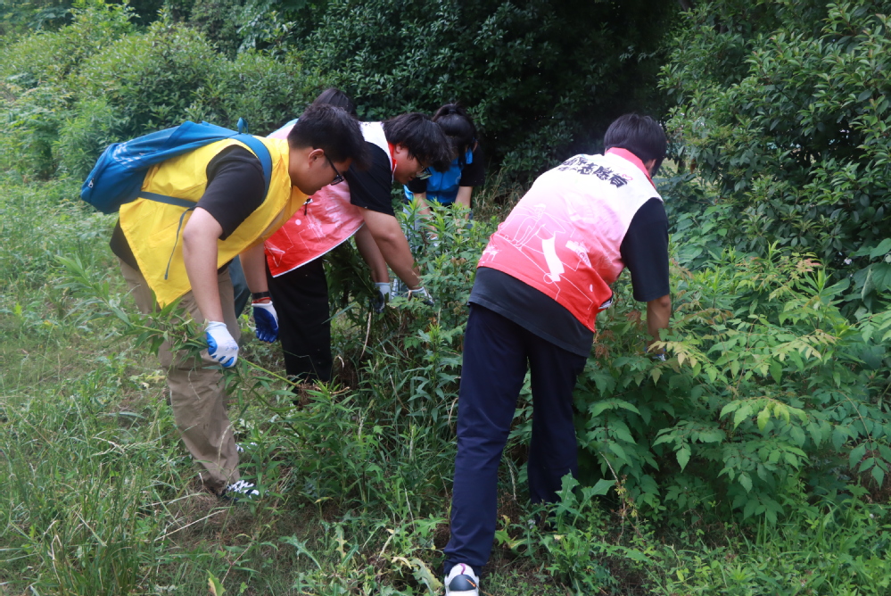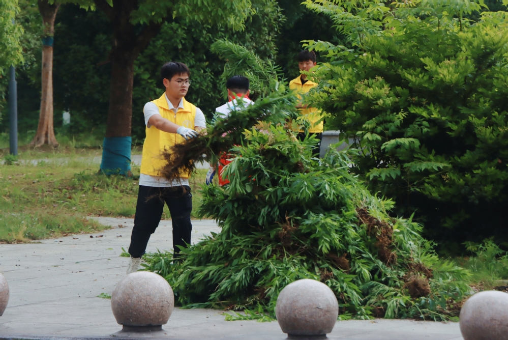 另一支队伍则成为“绿色卫士”,积极投身社区美化行动。志愿者们与社区工作人员并肩协作,在社区的各个角落仔细搜寻、奋力清除具有强大入侵性的“加拿大一枝黄花”。清除过程中,蚊虫众多、杂草丛生,依然阻挡不住志愿者们的热情,他们充分发扬了吃苦耐劳、不怕脏、不怕累的精神,用实际行动为守护社区的绿色生态贡献青春力量。为了让同学们全面体验活动内容、锻炼综合能力,一段时间后,两队任务互换,同学们迅速适应新角色,继续以饱满的热情投入到各项志愿服务工作中。