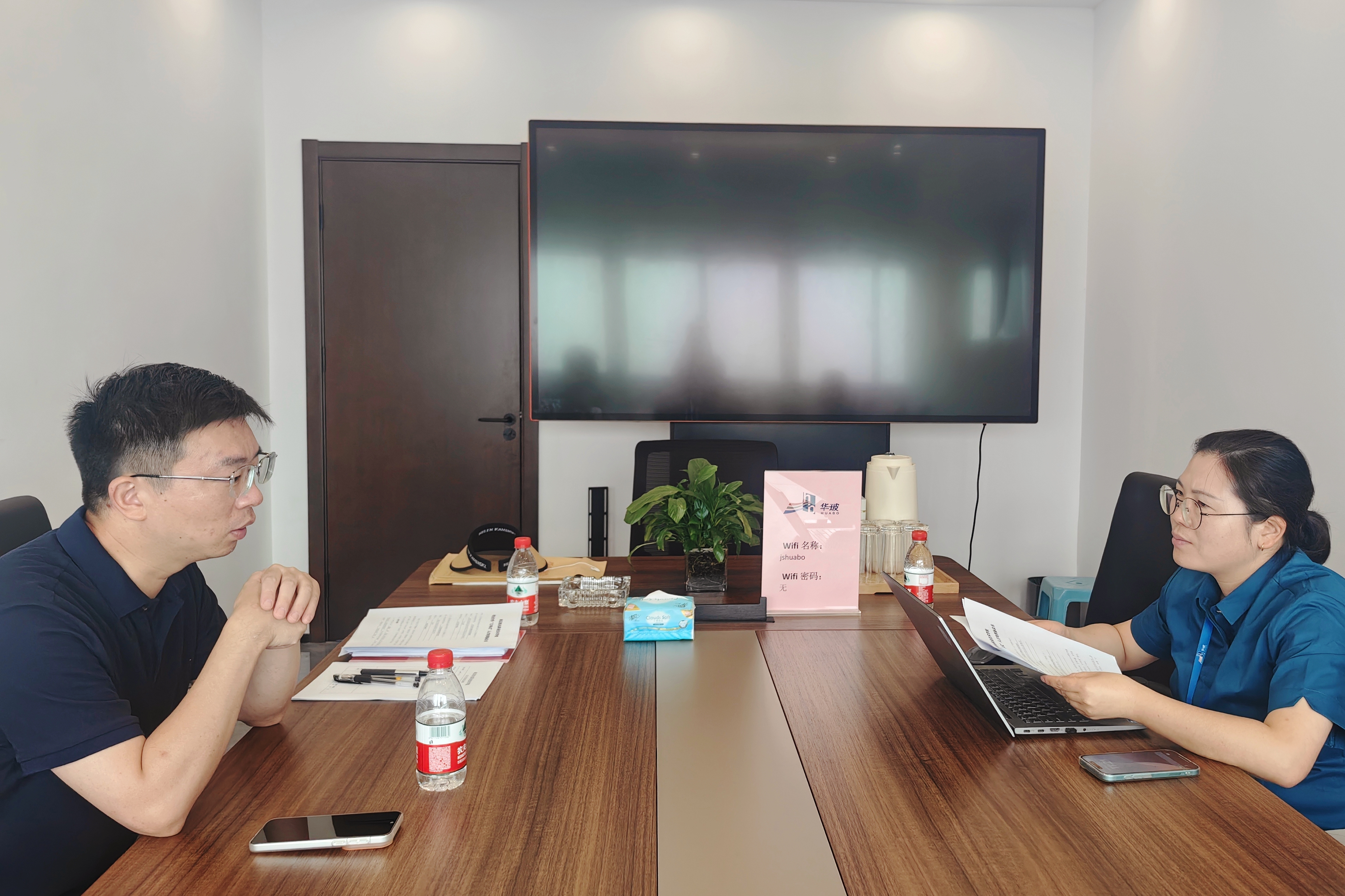 在江苏华玻光电技术有限公司,杨军一行与企业人事经理王红燕进行了座谈。双方围绕实习生人文关怀、实习问题反馈通道以及订单班管理等事宜交换了意见。
