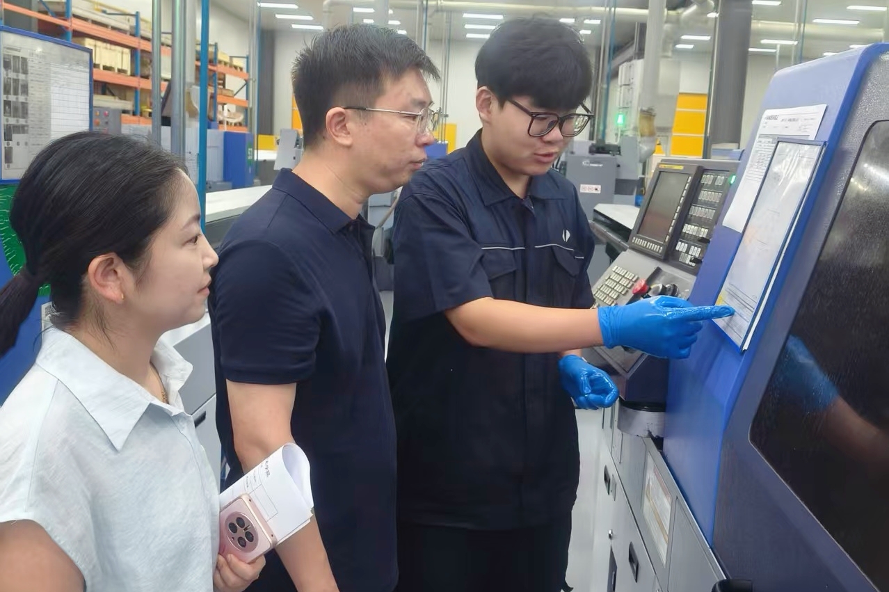 在范德威尔(中国)纺织机械有限公司的自动化纺织设备调试现场,实习生们正跟着带教导师学习设备控制系统操作。杨军详细了解同学们的工作内容、生活状况及思想动态,鼓励大家珍惜实习机会,主动作为,积极锻炼,充分发挥专业所长,在实践中不断成长。