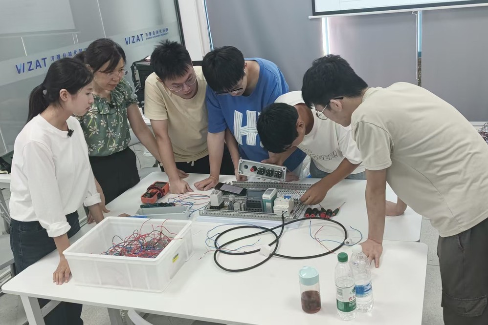 两周的培训内容紧扣企业实际需求,涵盖常用电气元件、气动元件工作原理、PLC编程、变频器操作及电动机运行机制等核心知识点。与传统课堂教学不同,万骓自动化采用项目导入式教学,将每个知识点融入真实的企业项目场景中。学生们直接参与模拟生产线的控制项目,通过理论讲解与工程师的实操演示相结合,快速掌握工作接线方法与调试技巧。
